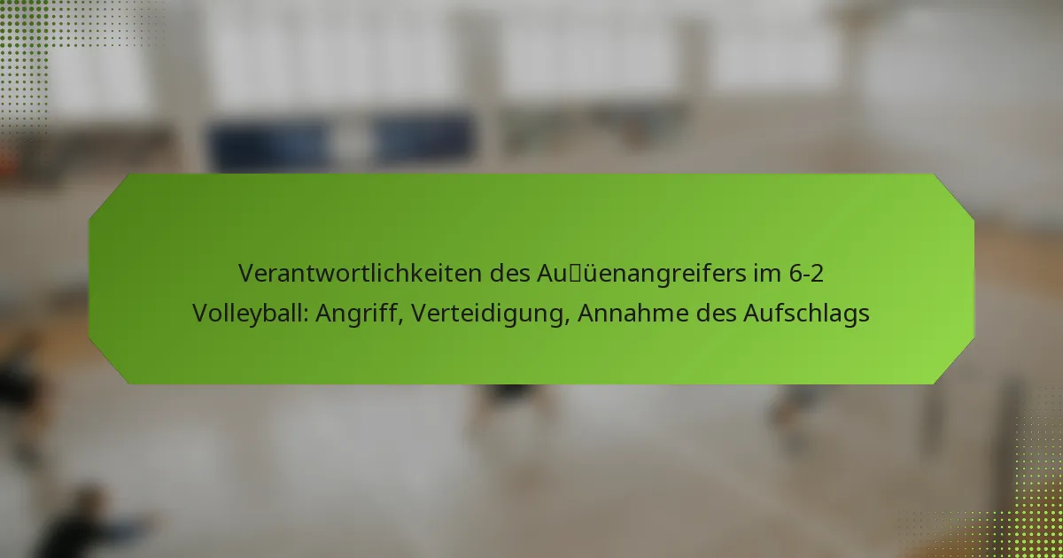 Die Kernverantwortlichkeiten eines Außenangreifers in einem 6-2 Volleyballsystem umfassen das Angreifen, Verteidigen und die Teilnahme am Annahmespiel. Diese Position ist entscheidend sowohl für offensive Spielzüge als auch für defensive Strategien und erfordert ein vielseitiges Fähigkeiten-Set, um sich an verschiedene Spielsituationen anzupassen.